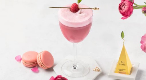 - In a cocktail shaker, combine the tea-infused gin, raspberry syrup, lemon juice and egg white.