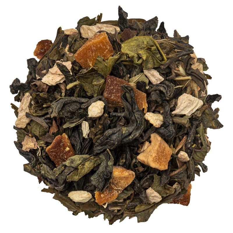 Green Mango Peach with the highest quality green tea leaves, blended with fresh peppermint, with fresh mango flavour and the lush sweet, juicy taste of peach.