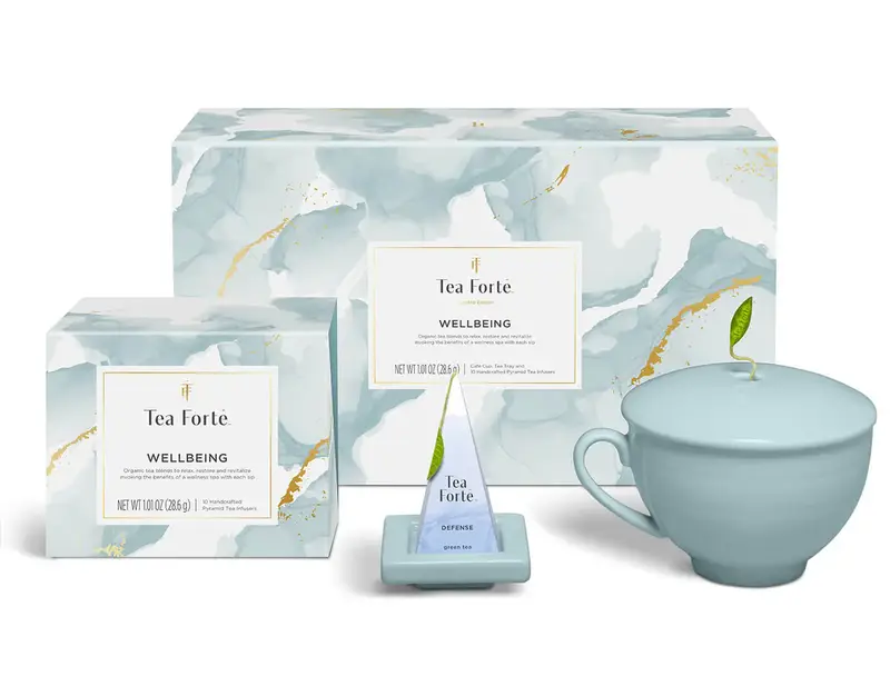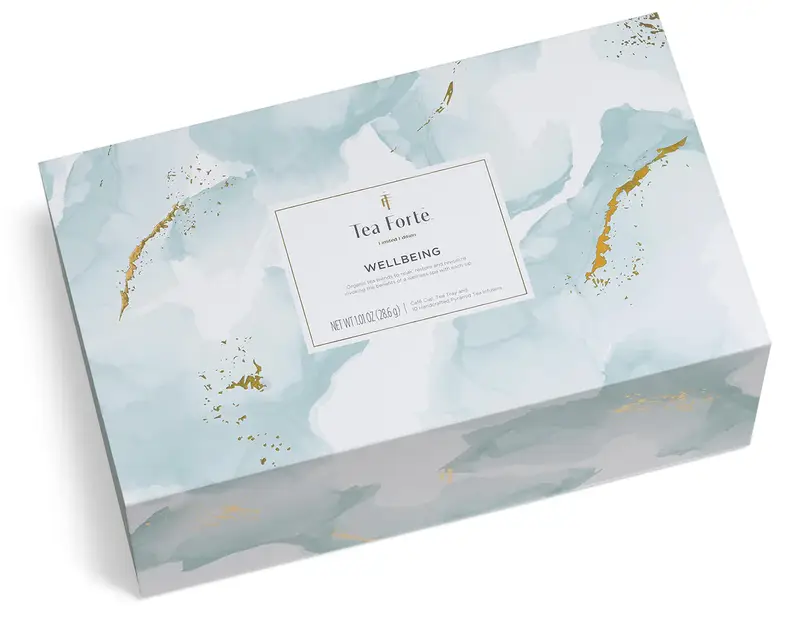 - One limited edition Wellbeing Mini Petite Presentation Box of 10 pyramid tea infusers, two of each blend: Defense (Green tea), Invigorate (Green tea), Purify (Herbal tea), Radiance (Herbal tea), and Serenity (Herbal tea).