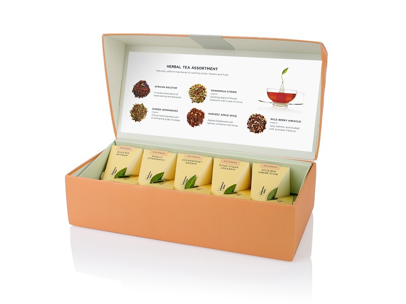 The Herbal Tea Assortment Petite Presentation Box contains 10 pyramid tea infusers, 2 each of the following herbal tea blends: African Solstice, Chamomile Citron, Ginger Lemongrass, Harvest Apple Spice, and Wild Berry Hibiscus. The open lid reveals a detailed tasting menu. Caffeine-free.