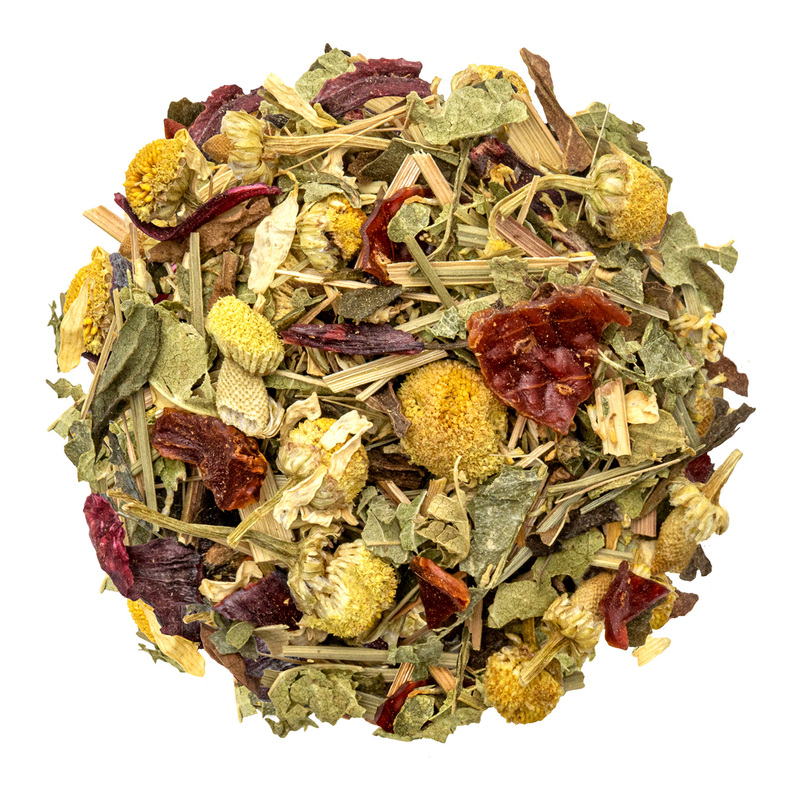Tea Forté herbal Chamomile tea is made with Egyptian chamomile, renowned for its distinctive apple-like taste. It is a unique refreshing herbal tea mixed with chamomile, rosehips, lemongrass, hibiscus, lemon verbena and licorice root.