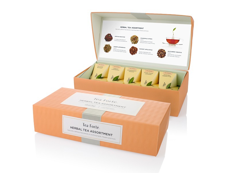 The Herbal Tea Assortment Petite Presentation Box contains 10 pyramid tea infusers, 2 each of the following herbal tea blends: African Solstice, Chamomile Citron, Ginger Lemongrass, Harvest Apple Spice, and Wild Berry Hibiscus. The open lid reveals a detailed tasting menu. Caffeine-free.