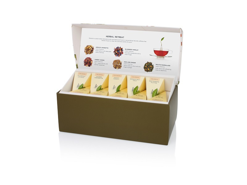 Our Herbal Retreat Presentation Box contains 20 caffeine-free pyramid tea infusers, 4 of each herbal blend: Apricot Amaretto, Blueberry Merlot, Cherry Cosmo, Kiwi Lime Ginger, Mojito Marmalade. 100% organic.