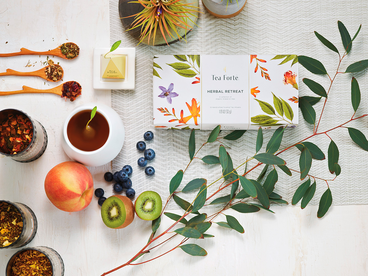 Le tisane di Tea Forté sono preparate con cura con erbe raccolte a mano, fiori aromatici, frutti salutari, spezie pregiate, radici, semi e piante rare provenienti da tutto il mondo, per offrire una vasta gamma di aromi, sapori e consistenze.